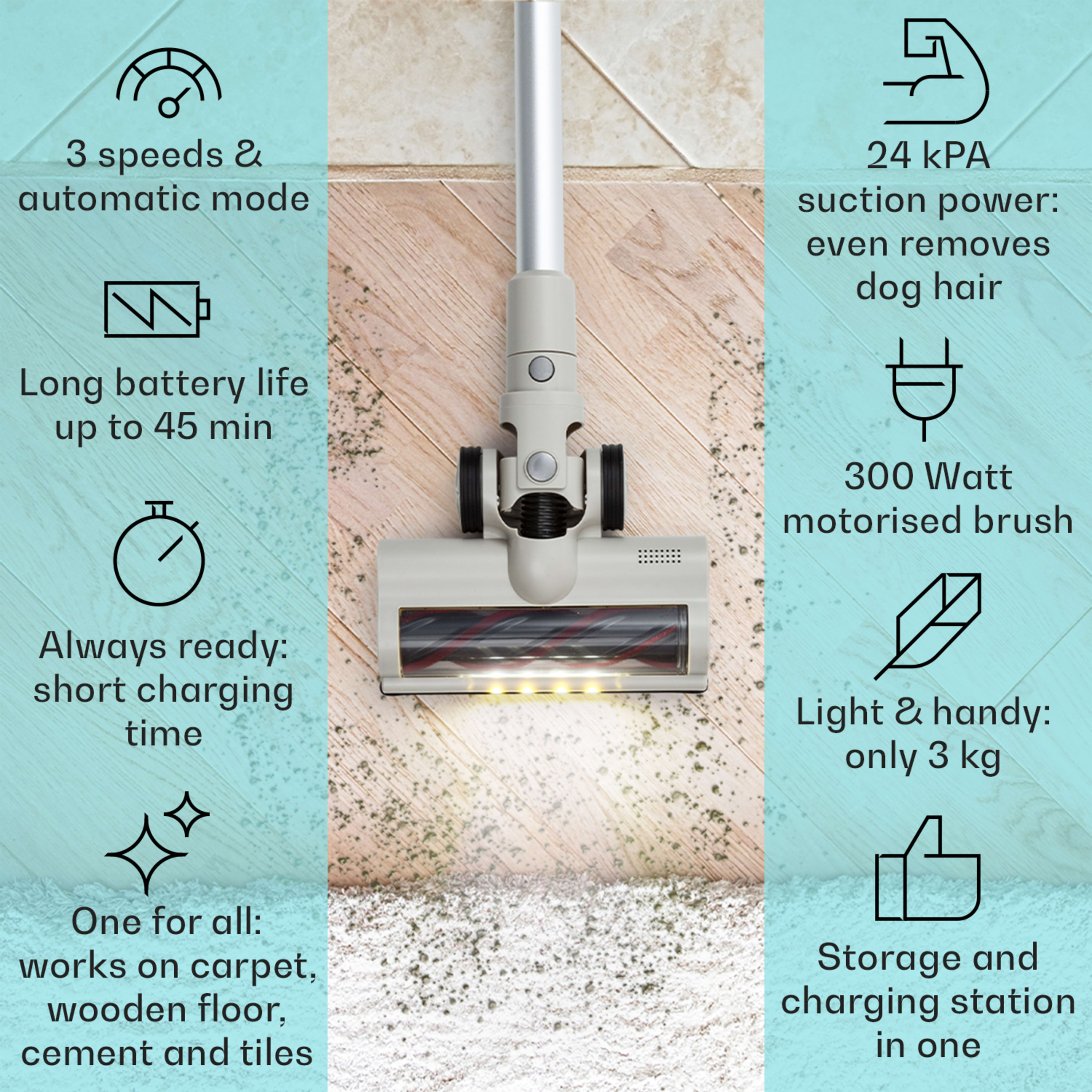 Bezdrôtový, bezvreckový a výkonný vysávač Klarstein LARMA si hravo poradí s prachom a nečistotami. Jeho integrovaný snímač prachu automaticky prispôsobuje úroveň výkonu čistenému povrchu. Výkonný motor LARMA dokáže nepretržite vysávať vlasy, omrvinky a chumáče do nádoby na prach, ktorá je vybavená filtrom EPA E12, až 45 minút. Motorizovaná podlahová kefa s LED osvetlením sa dostane aj na ťažko prístupné miesta a jej dva prídavné nadstavce na hubicu dopĺňajú univerzálne schopnosti vysávača.