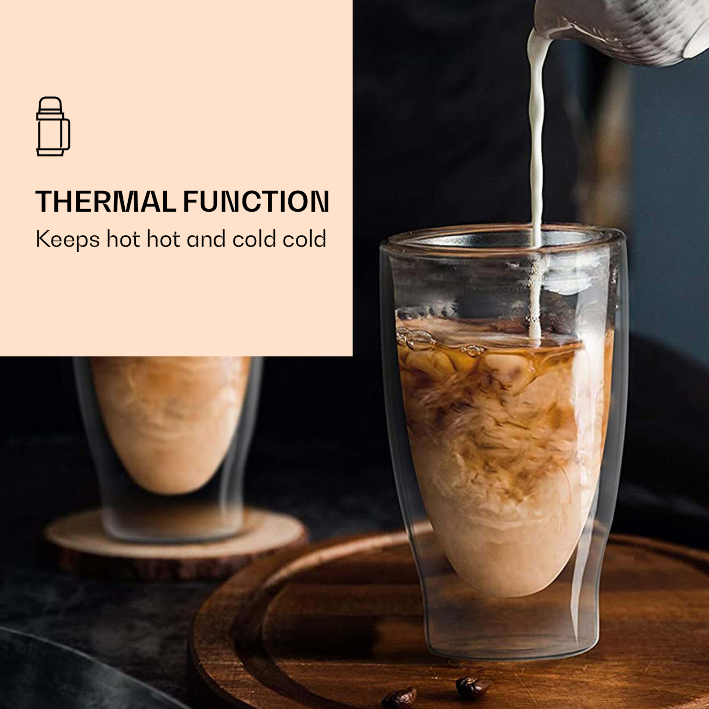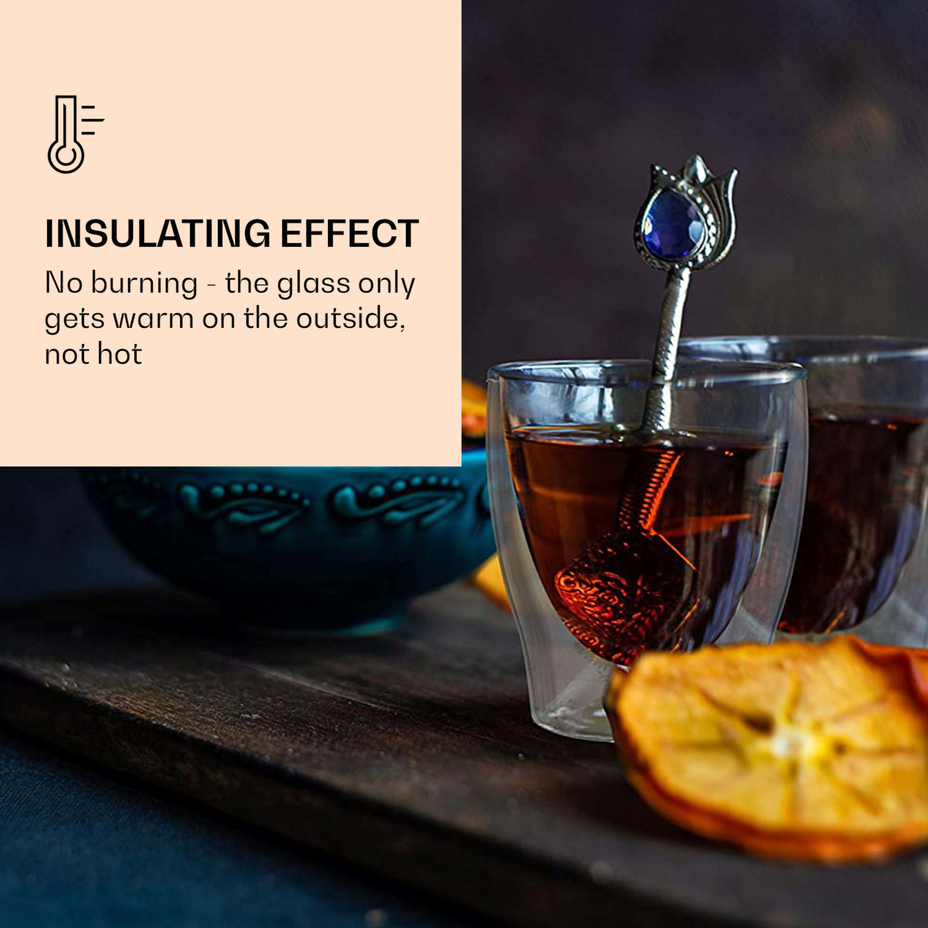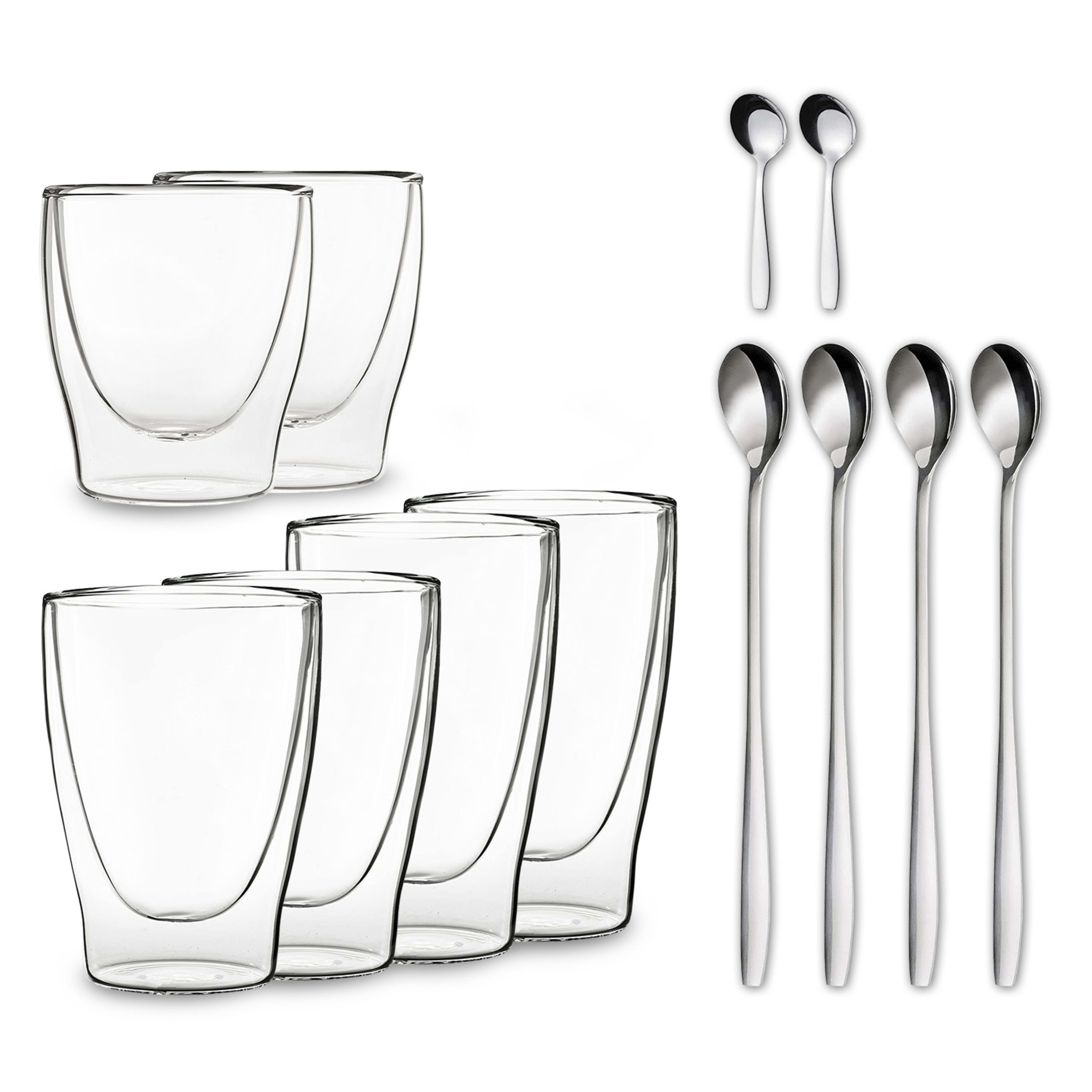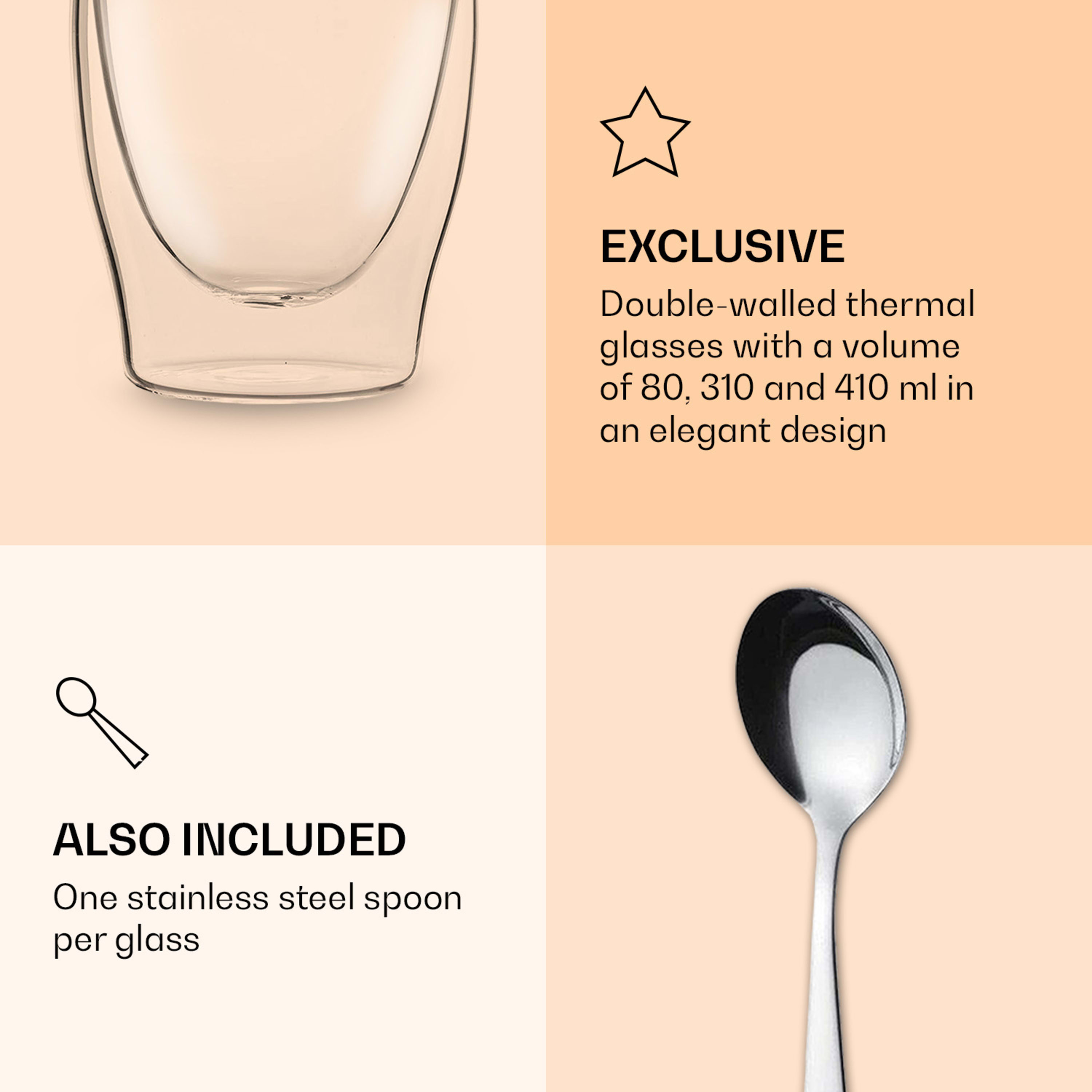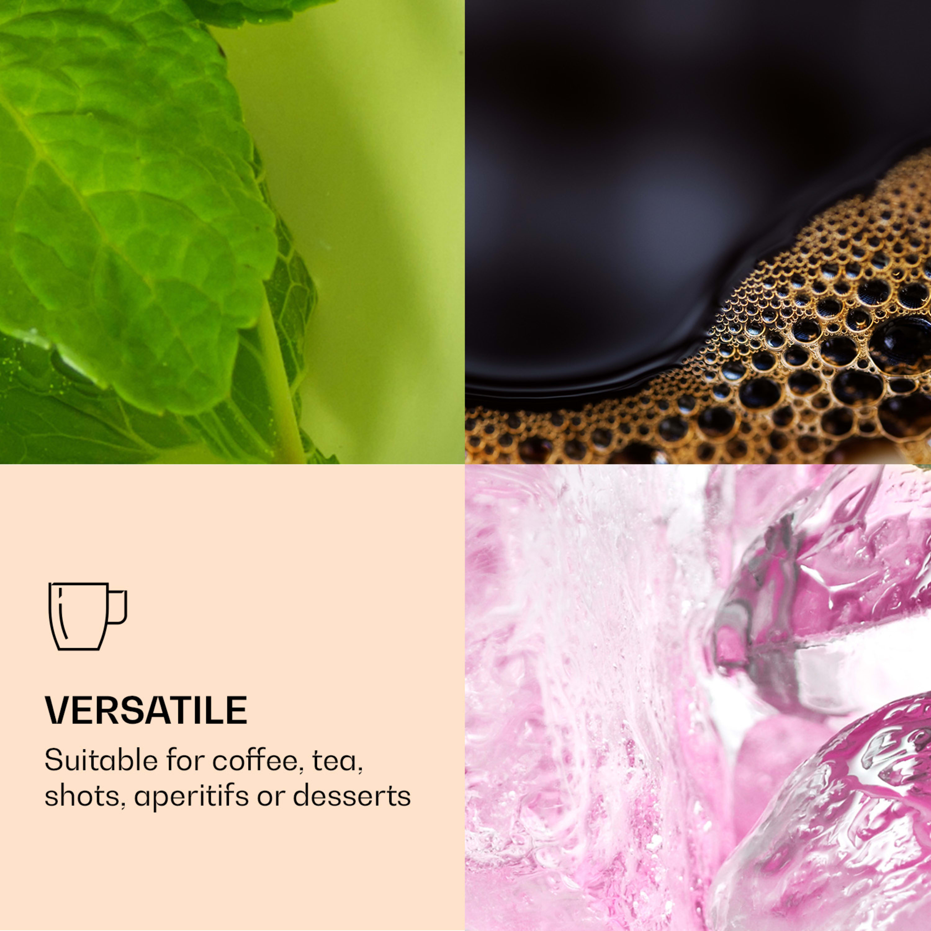 Luxusný pohár DUOS od Feelino by Klarstein je vyrobený ručne a svojím elegantným dizajnom obohatí vaše obytné prostredie. Dvojitá sklenená vrstva udrží studené nápoje dlhšie studené a teplé nápoje dlhšie teplé. Tento atraktívny pohár na espresso, čaj, panáky, aperitívy alebo dezerty je vyrobená z borosilikátového skla a je mimoriadne odolný a žiaruvzdorný: Je odolný proti poškriabaniu, veľmi ľahký a samozrejme vhodný do umývačky riadu. Systém dvojitých stien poskytuje aj úžasný optický efekt, vďaka ktorému sa zdá, že sa kvapaliny vznášajú. Vďaka lyžičke z nehrdzavejúcej ocele ku každému poháru je sada pohárov dokonalá!