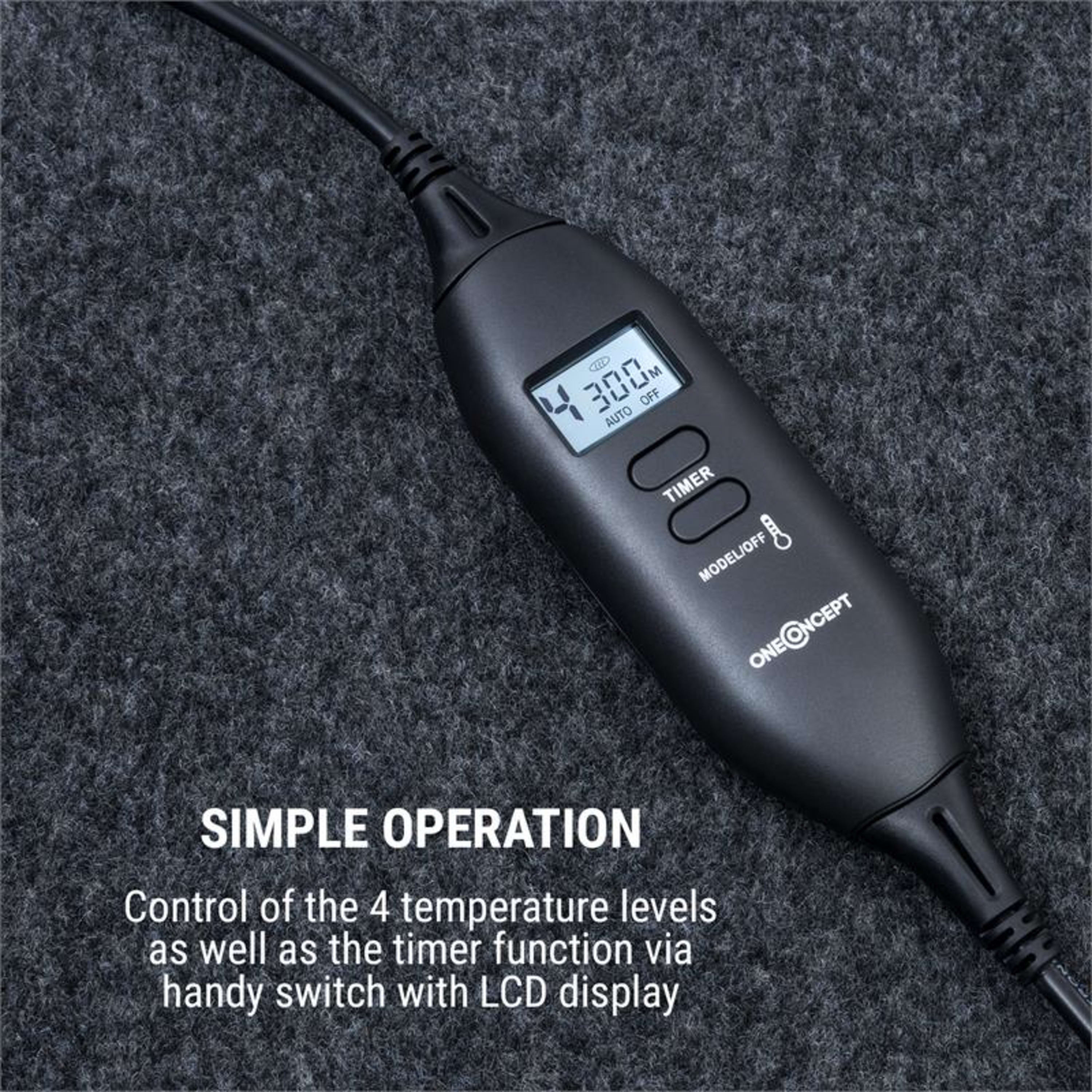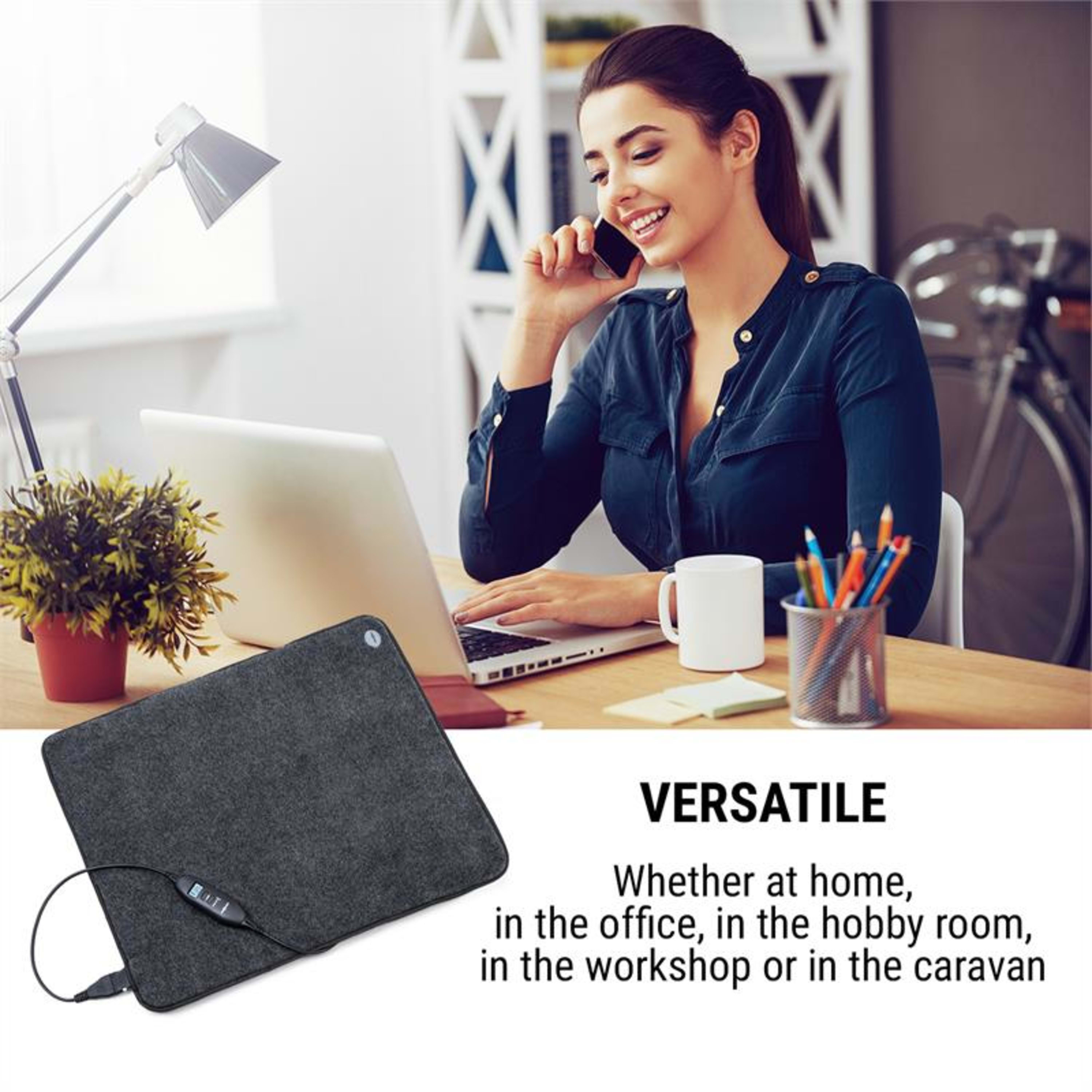 S výkonom 100 W sa kedykoľvek postará o teplé chodidlá napríklad v obývačke, kancelárii, v hobby miestnosti alebo aj v obytnom prívese. Vyhrievacia podložka sa ovláda pomocou šikovného spínača s LCD displejom. Pomocou neho je možné jednoducho nastaviť 4 úrovne teploty aj praktický časovač so 7 časmi vypnutia. Povrch koberčeka garantuje maximálnu hebkosť, pritom je však veľmi pevný a odolný. Na zadnej strane sa nachádzajú malé hrčky, ktoré sa postarajú o nekĺzavosť na hladkých podlahách. Vďaka praktickému pripojeniu na okraji podložky je možné pri čistení estetickú vyhrievaciu podložku ľahko odpojiť od napájania – jej prášenie a dôkladné čistenie budú hračkou. S neutrálnou antracitovou farbou vizuálne zapadne vyhrievacia podložka do každého obytného alebo kancelárskeho priestoru. Odovzdávanie tepla prebieha po krátkej dobe zahriatia konštantne a energeticky úsporne.
