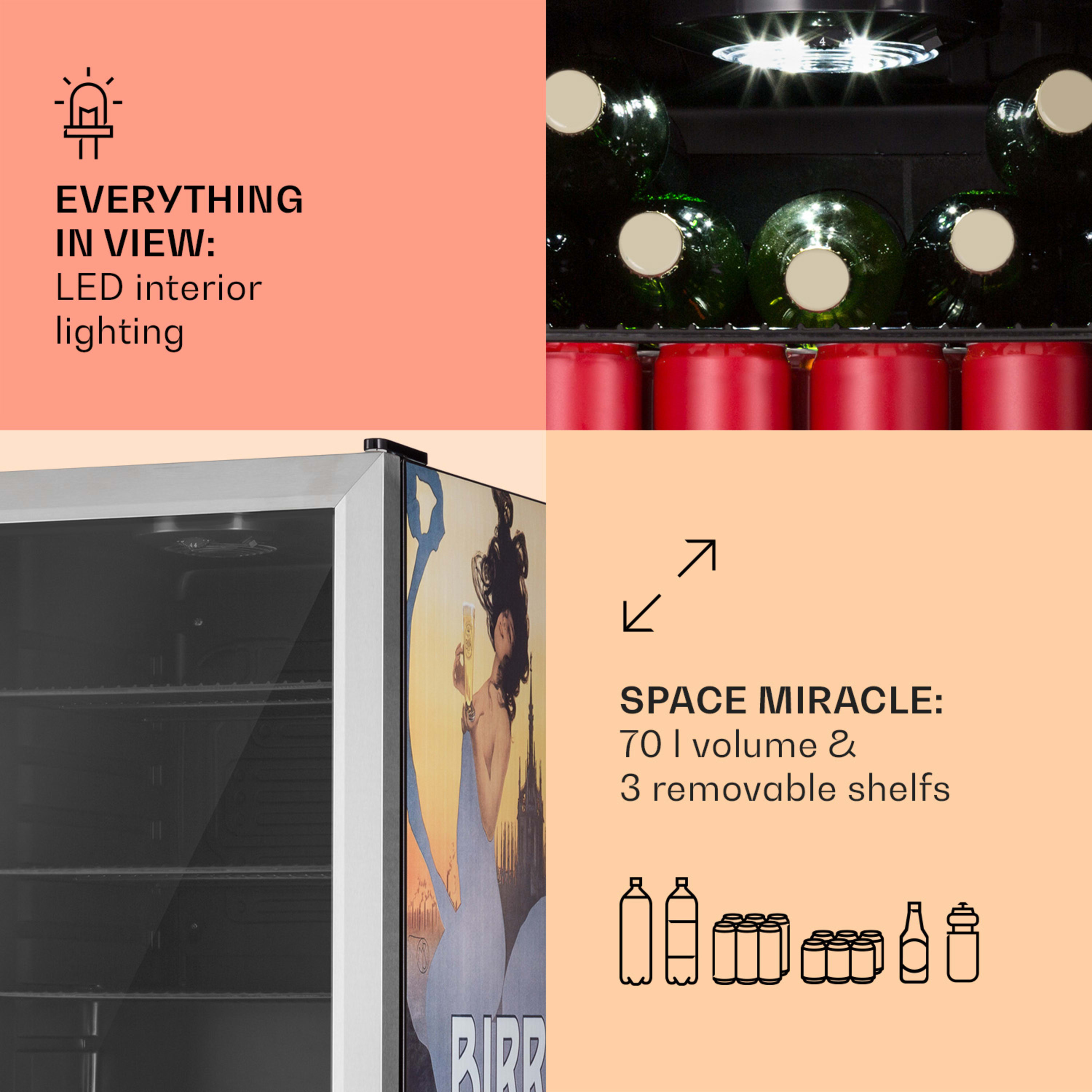 Dobre vychladené osvieženie je lepšie: Klarstein Beersafe 70 je kompaktná chladnička na nápoje s objemom 70 litrov. V trblietavej edícii Birra Milano osvieži svoje okolie štýlovou potlačou s motívom piva a dodá kuchyni alebo hobby miestnosti extra šmrnc.