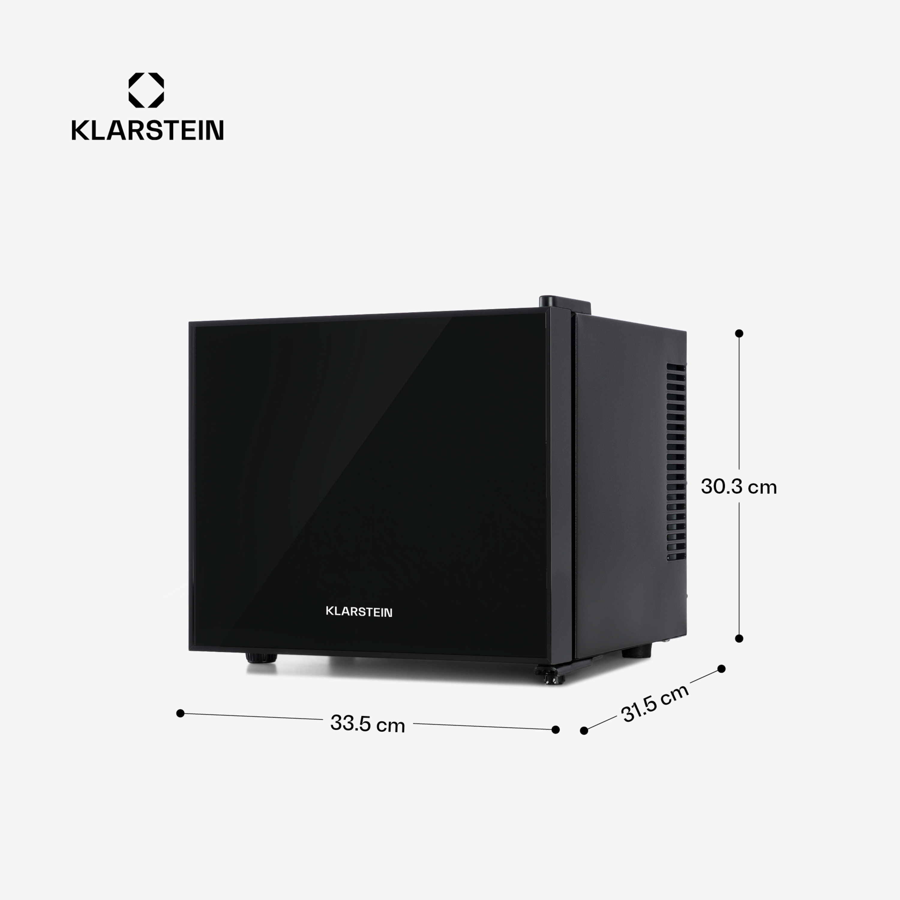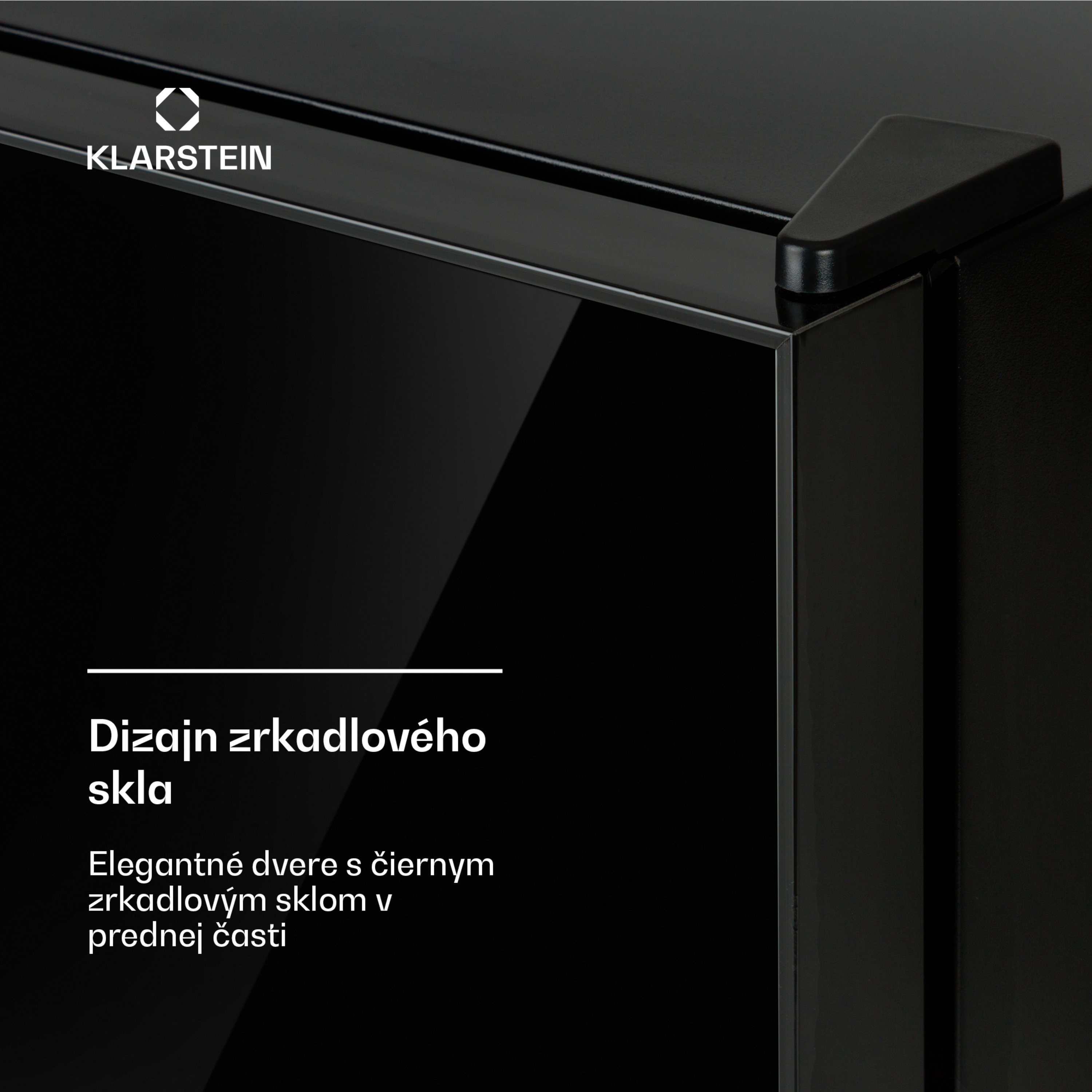 Malá chladnička v zrkadlovej čiernej farbe. Mini chladnička Klarstein Frosty pomôže pri skladovaní občerstvenia, nápojov, liekov alebo kozmetiky pri nízkych teplotách – v hosťovskej izbe, na internáte alebo v spálni.