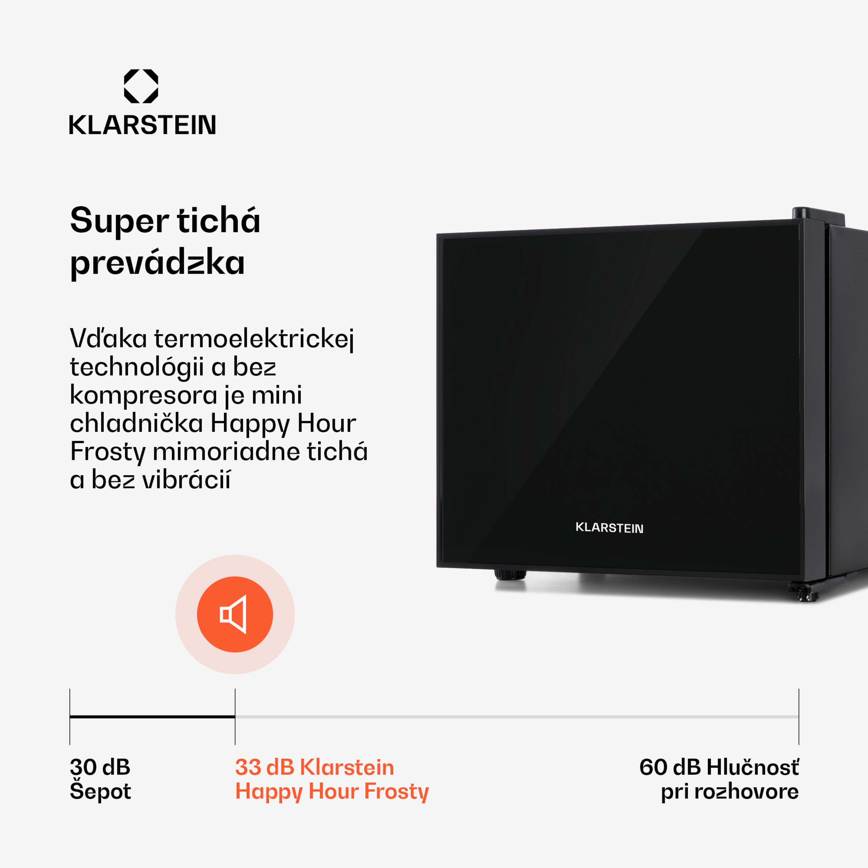 Aj exteriér kompaktnej chladničky Klarstein Frosty je žiarivý, pretože celý predný panel je vyrobený z čierneho zrkadlového skla. Vďaka tomu je Frosty v každom prostredí nielen mini chladničkou, ale tiež zaujímavým dizajnovým prvkom. Aby sa dalo zariadenie používať kdekoľvek, termoelektrický chladiaci systém vytvára iba tichý pracovný hluk s 33 dB, a tak ho možno bez problémov umiestniť aj v spálňach bez narušenia spánku.