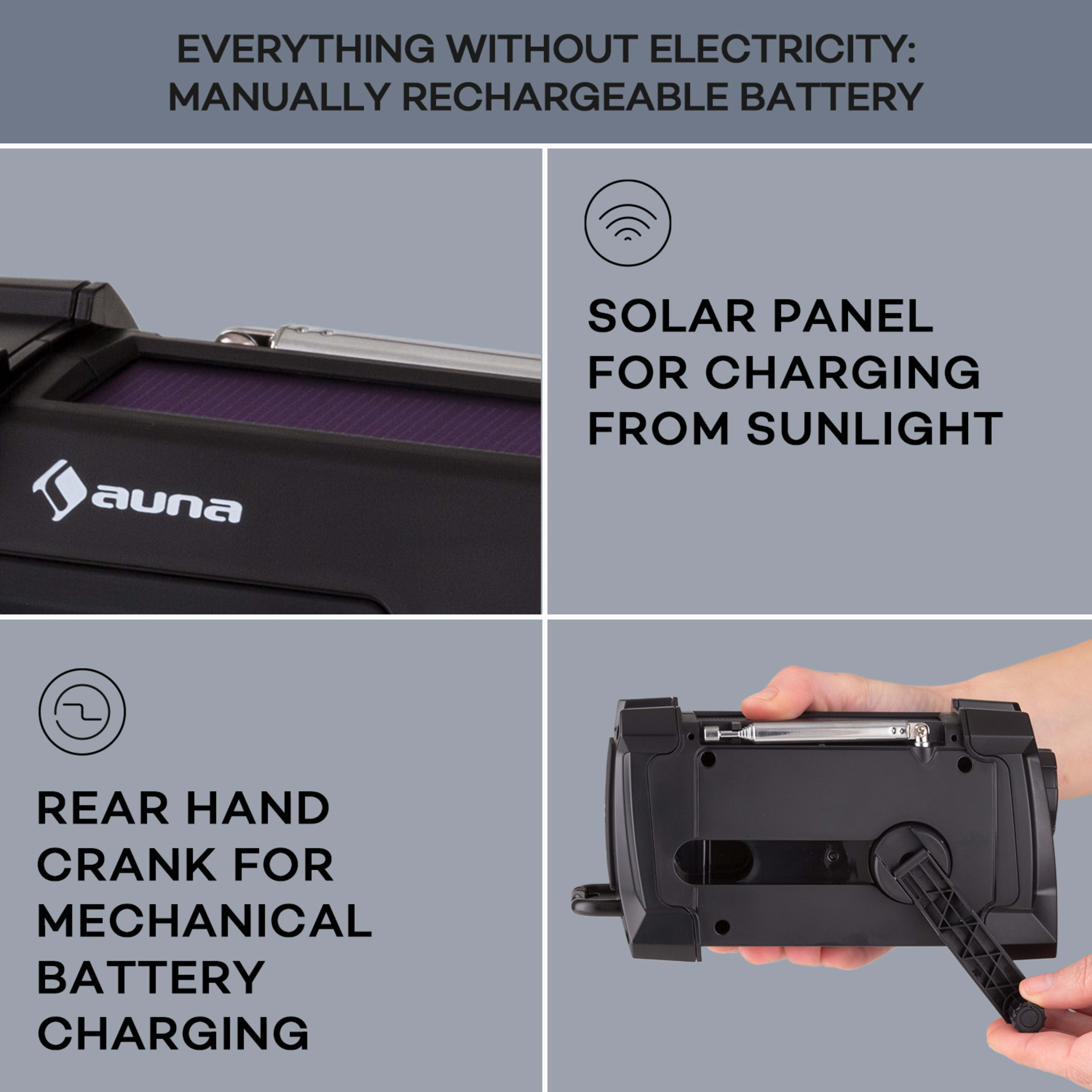 Sebestačnosť: vstavaná lítium-iónová batéria so solárnym alebo kľukovým nabíjaním