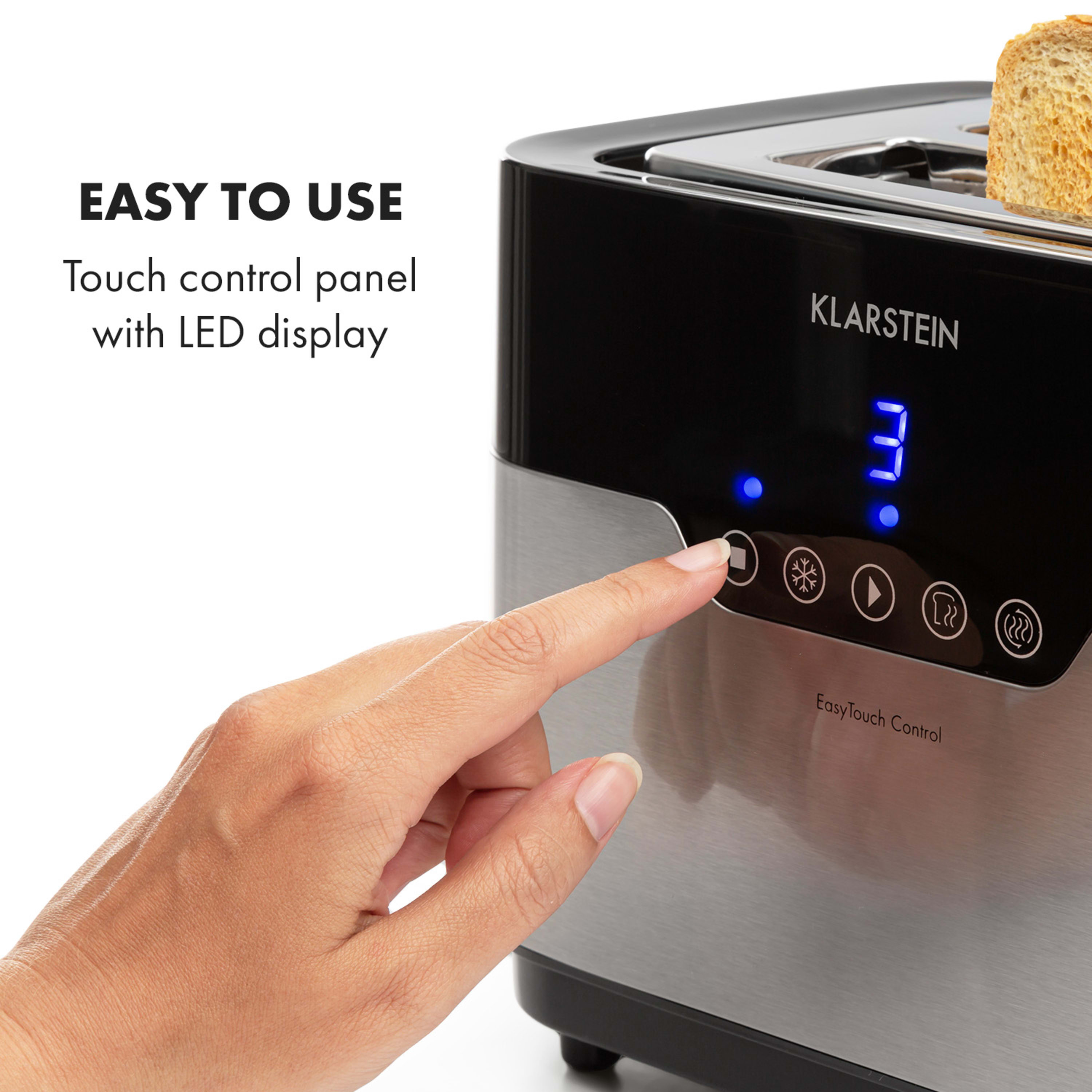 Vďaka silným 920 wattom sú hrianky a iné druhy pečiva v okamžiku opečené a pripravené na konzumáciu. Ovládanie je detsky ľahké: stačí vložiť požadované plátky do hriankovača a zvoliť úroveň opečenia a funkciu na dotykovom paneli, LED displej jasne ukazuje zvolenú voľbu. Flexibilná kovová mriežka sa prispôsobí hrúbke každého chleba a jemne ho tlačí nadol. Okrem siedmich nastaviteľných stupňov opečenia ponúka hriankovač aj funkciu rozmrazovania, zohrievania a funkciu prerušenia. Na pečenie pečiva je k dispozícii nádstavec, ktorý sa v prípade potreby dá umiestniť na hriankovač.